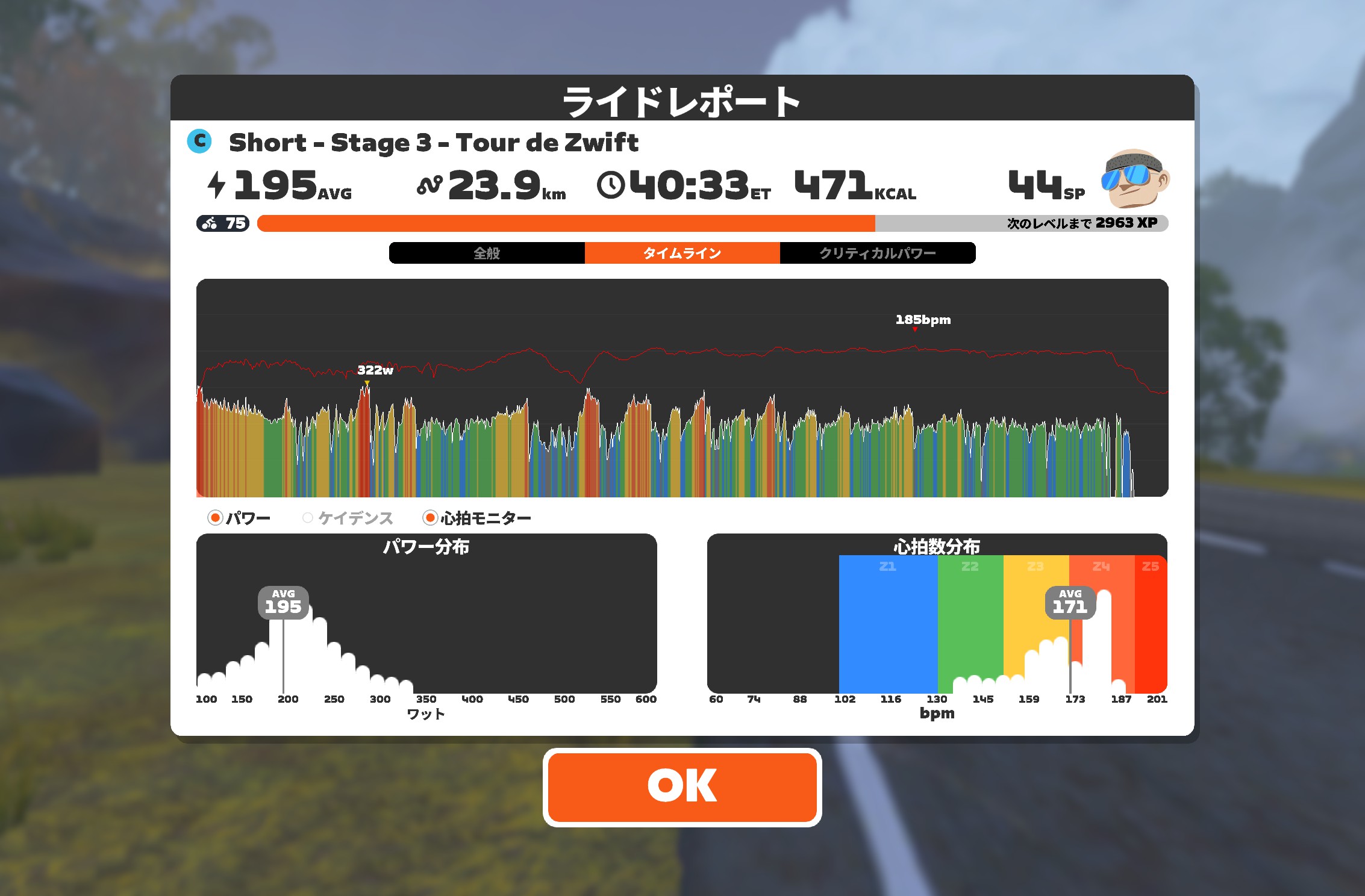 トレーニング記録260119【ロードバイク&筋トレ】 04-筋トレ X Facebook0 はてブ0 LINE 2026.01.21 昨日も無理矢理早く帰って、奥様とウォーキング。 近所のCOOPまで。 その後筋トレ行って脚をガッツリ。 帰って、ZWIFTでレースに参加。 290人中75位くらい。。。坂区間でいつも置いていかれる、というかパワーが全然でない。多分、パワーメーターがいかれているのかもしれないな、なんて。 40分しかやってないけど、どっぷり疲れた。 この記事が「いいね」と思った人は下記のバナーのどれかを押していただけると嬉しいです。