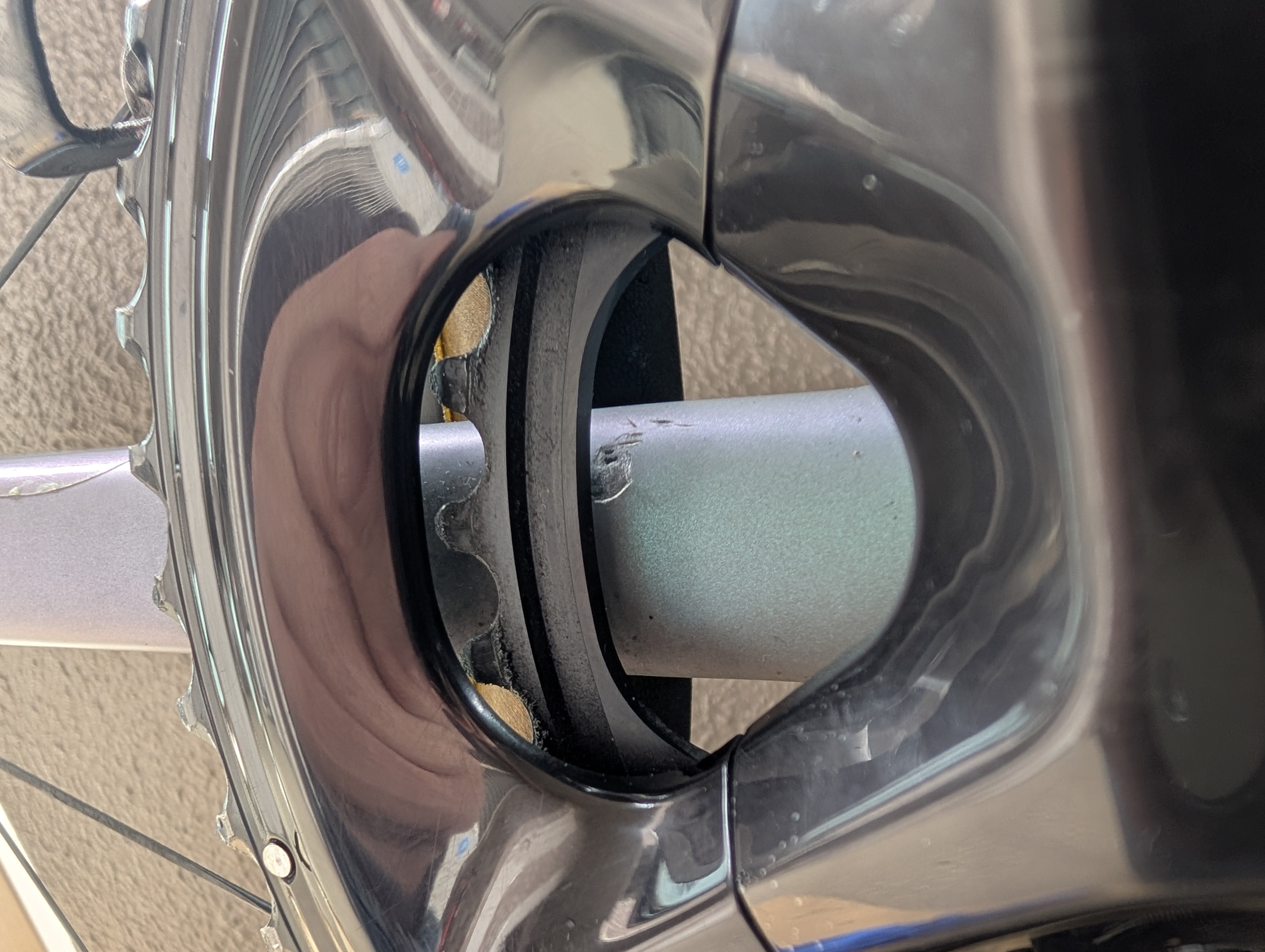 一瞬、割れてるのか?と思ったが、恐らくチェーン落ちした時についた傷。塗装剥がれと言った方が良いだろうか?