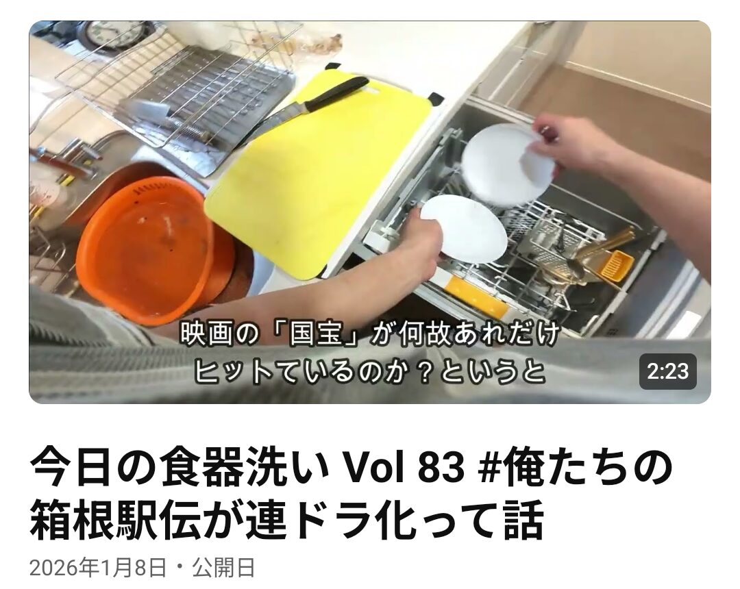 食器洗い動画 20260108 食器洗い動画 X Facebook0 はてブ0 LINE 2026.01.08 最近毎日食器洗い動画を頑張ってアップしている。 俺達の箱根駅伝がドラマ化されるって話。 毎日アップしようと思うので、良ければちゃんねる登録してください。 この記事が「いいね」と思った人は下記のバナーのどれかを押していただけると嬉しいです。