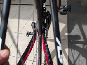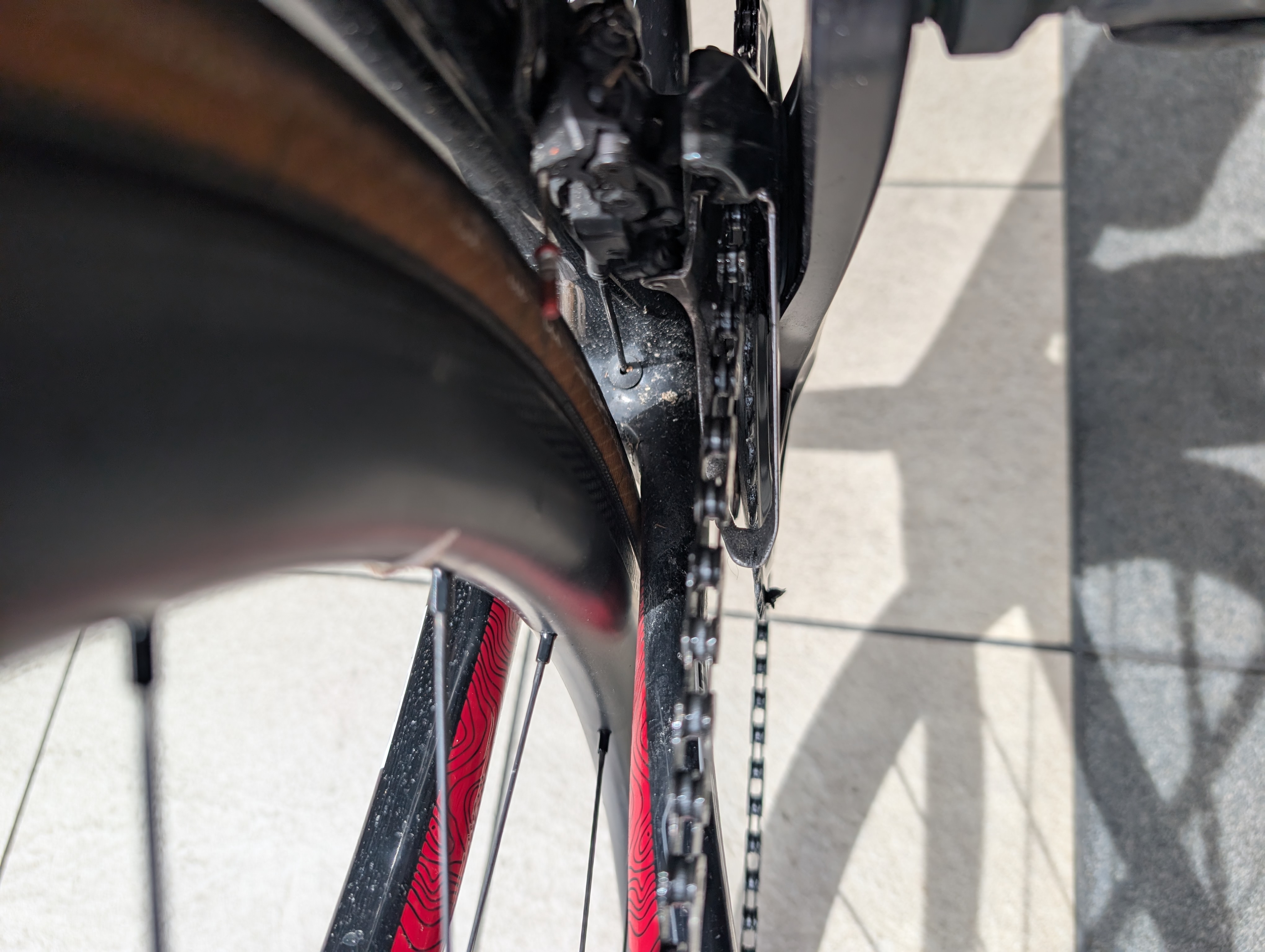 帰って、ふとロードバイクを見たら、リアタイヤがフレームを擦っていた、、、よくコレで走れたものだ。
